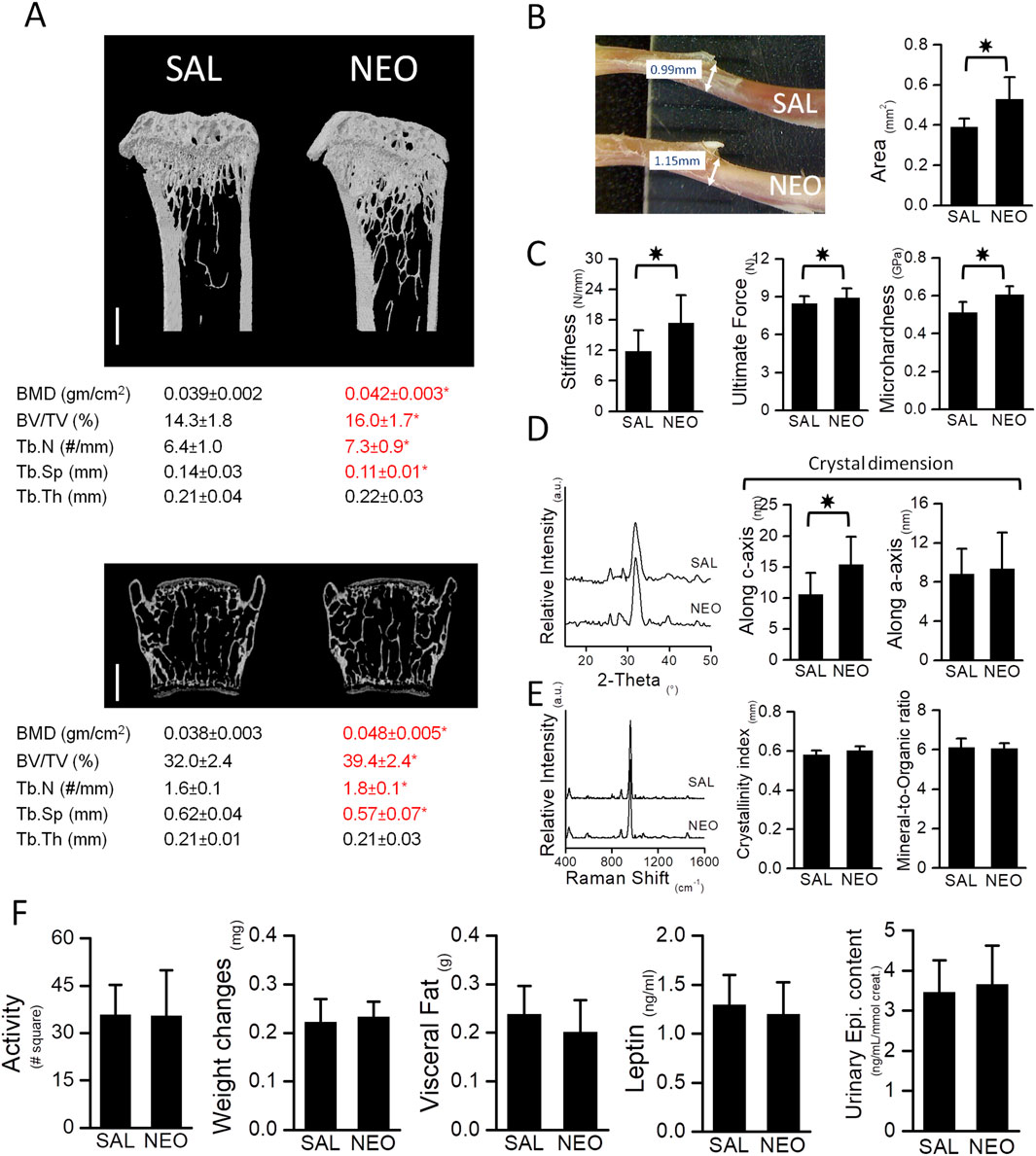 Figure 1. Neostigmine, a peripherally acting AChEI, favors bone mass and enhances the biomechanical properties of bones. (A) μCT images of tibia (top) and vertebra (bottom). Scale bars, 500 μm. Neostigmine-treated mice had higher bone mineral density (BMD), bone volume (BV/TV), trabecular number (Tb.N) and lower spacing between trabeculae (Tb.Sp) compared to the saline-treated mice. No significant change in trabecular thickness (Tb.Th) was observed between the two groups. (B) A photograph showing the diameter of tibiae obtained from mice treated with saline (SAL) (top) or neostigmine (NEO) (bottom). Cross sectional area of mid shaft tibiae in neostigmine-treated mice were larger compared to the saline-treated mice. (C) Three-point-bending and Vickers’ microhardness tests showed higher bone stiffness, ultimate force and microhardness in neostigmine-treated mice compared to control. (D,E) XRD and Raman spectroscopy analyses revealed that bones of the neostigmine-treated mice had larger crystal dimensions along the c-axis with no changes in crystallinity index and mineral-to-organic ratio compared to the control group. (F) No significant differences were observed in locomotor activity, body weight, body visceral fat and serum leptin levels or urinary epinephrine levels between the neostigmine- and saline-treated mice, indicating that neostigmine did not alter the SNS tone. (n = 9/group). Data are mean ± SD. *p < 0.05.