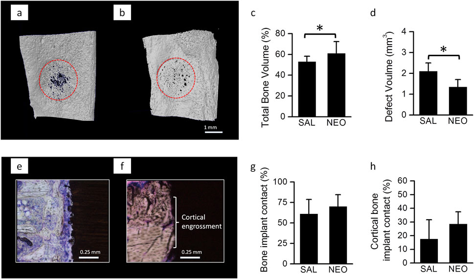 Figure 2. Bone healing and implant osseointegration in neostigmine-treated rats: (a) 3-D reconstructions of 2-week old bone defects on medial surface of the tibiae in rats treated with neostigmine (NEO) and saline (SAL) showing that neostigmine improved healing of the bone defects. (b,c) µ-CT analyses of the bone defects showing that neostigmine-treated rats had higher bone volume and thus, smaller defect volume compared to saline-treated rats (n = 9/group). (d) Longitudinal histological sections of Ti implant placed in rats tibiae showing the bone-implant contact in neostigmine- and saline-treated rats. (e–h) Histomorphometric analyses for bone-implant contact showed no significant difference between neostigmine- and saline-treated rats. Data are mean ± SD. *p < 0.05.