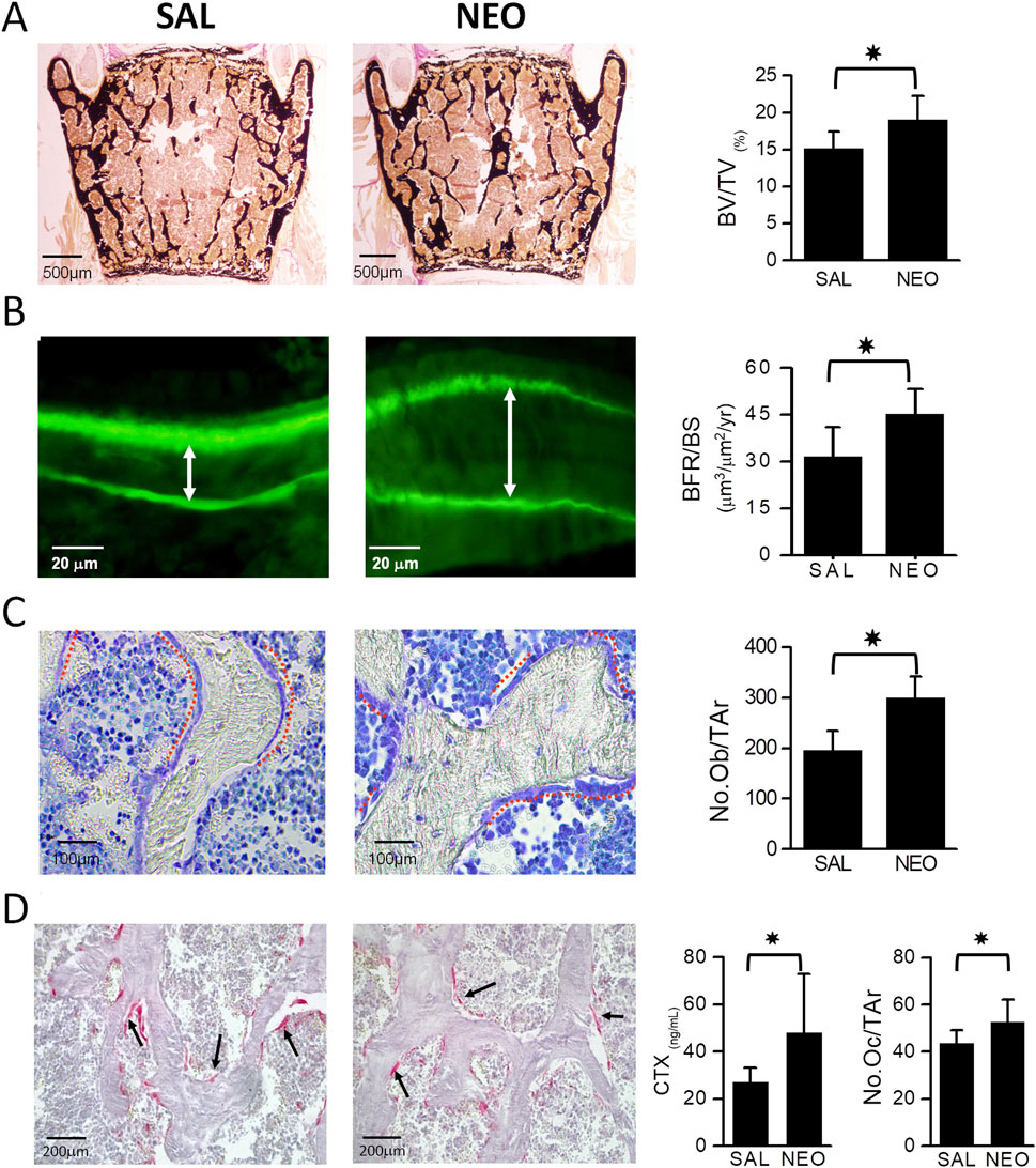 Figure 3. Neostigmine treatment increases bone mass by stimulating bone formation rate. (A) Von Kossa and van Gieson-stained lumbar vertebra sections showing that mice treated with neostigmine (NEO) had higher BV/TV compared to saline (SAL). (B) Calcein double labeling shows a significantly increased bone formation rate over bone surface (BFR/BS) in neostigmine-treated mice compared to controls. The white arrows show the distance between calcein double labels. (C,D) Toluidine blue- and tartrate-resistant acid phosphatase (TRAP)- staining of lumbar vertebra sections demonstrates that the osteoblast and osteoclast numbers were significantly higher in neostigmine-treated mice than in control mice. In agreement with the increase in osteoclast number, the serum collagen C-terminal telopeptide (CTX) was increased in the neostigmine-treated group compared to the saline-treated group. Data are mean ± SD. (n = 9). *p < 0.05.