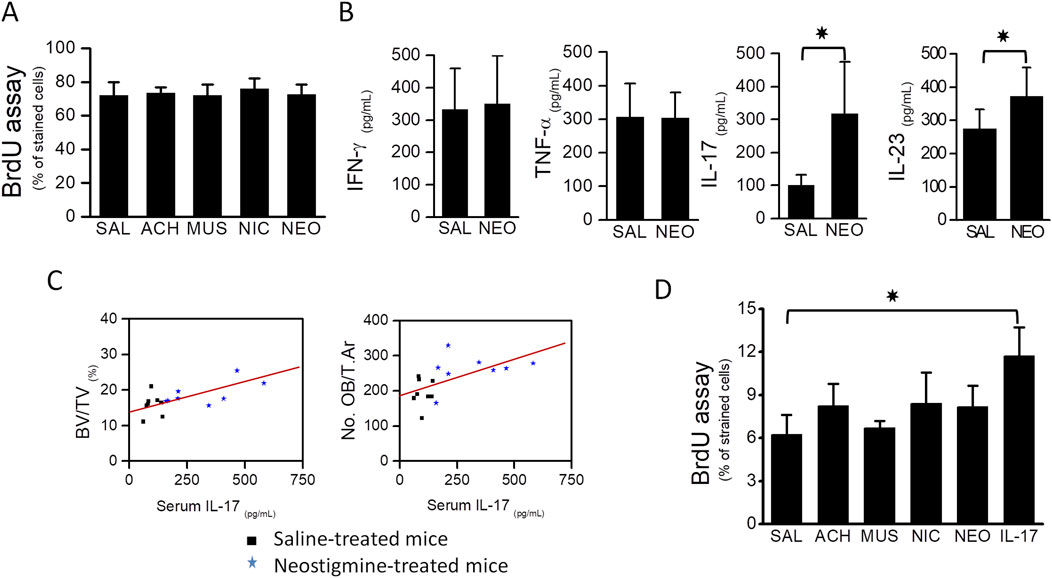 Figure 4. Osteoblast proliferation was stimulated by the immunocytokine IL-17. (A) BrdU assay showing that proliferation of MC3T3.E1 preosteoblasts was not stimulated upon treatment with cholinergic ligands, acetylcholine, muscarine, nicotine and an AChEI, neostigmine. (B) Graphs showing serum levels of TNF-α, IFN-γ, IL-17 and IL-23 in neostigmine- and saline-treated mice. Serum IL-17 level was 3-fold higher in the neostigmine-treated group compared to the saline-treated group. Serum level of IL-23 was also increased in neostigmine-treated mice. (C) Graphs showing the associations between serum IL-17 level, obtained from neostigmine- and saline-treated mice, and bone volume (R = 0.624; p = 0.009) and osteoblasts number (R = 0.579; p = 0.029). (D) Proliferation rates of different MC3T3.E1 preosteoblast cultures treated for 4 days with either acetylcholine, neostigmine, IL-17 or saline (control) were assessed by BrdU analysis assay. As illustrated, the proliferation of MC3T3.E1 preosteoblasts treated with IL-17 was significantly higher than those treated with saline (control). Data are mean ± SD. *p < 0.05.