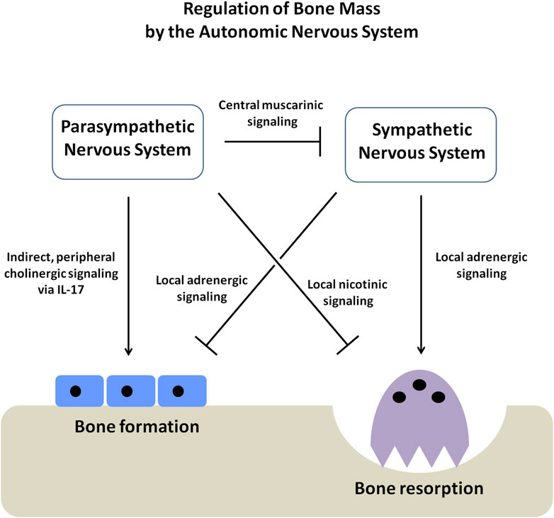 Bone remodeling is a lifelong process which is critical to maintain a healthy bone mass. This process involves a balance between bone resorption and bone formation and can be regulated both locally and centrally (Schett and David, 2010). The direct interactions between bone cells (i.e., osteoblasts and osteoclasts) and their interaction with immune cells (i.e., T-cells) regulate the net outcome of bone remodeling locally (Schett and David, 2010; Takaya and nagi, 2007). Centrally, bone remodeling is regulated through the hypothalamic-pituitary-thyroid axis, which coregulates bone, adipose tissue and energy metabolism via the adrenergic sympathetic arm (SNS) of the autonomic nervous system (Kondo et al., 2013; Katayama et al., 2006; Rosen, 2008; Hinoi et al., 2008; Elefteriou et al., 2005; Takeda et al., 2002; Ducy et al., 2000; Eimar et al., 2013). On the other hand, previous studies have provided evidence that the other arm of the autonomic nervous system, the cholinergic parasympathetic nervous system (PNS), also affects bone remodeling (Shi et al., 2010; Bajayo et al., 2012; Tamimi et al., 2012; Tamimi et al., 2018; Eimar et al., 2016).
