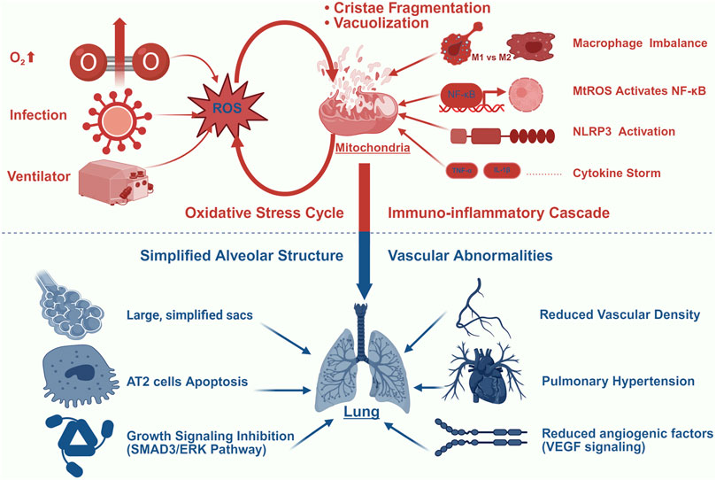 As the most prevalent chronic respiratory disease in preterm infants, BPD is pathologically characterized by a dysregulated inflammatory cascade (Watterberg et al., 1996). Emerging evidence positions mitochondrial dysfunction as a central regulator of pulmonary immune homeostasis disruption in this process. Mechanistically, impaired mitochondria release damage-associated molecular patterns, including mtDNA, mitochondrial ROS (mtROS), ATP, and cardiolipin. These molecules activate pattern recognition receptors, including Toll-like receptors and NLRP3 inflammasome components, thereby triggering pro-inflammatory cytokine cascades (Marzetti et al., 2024; Marchi et al., 2023; Mishra et al., 2021; Chen et al., 2023). Previous studies demonstrate that hyperoxia exacerbates this response through tumor necrosis factor-α (TNF-α) overproduction, which has been shown to depolarize mitochondrial membranes and enhance oxidative-inflammatory interactions in rodent models, potentially establishing a self-perpetuating injury cycle (Mu et al., 2021; Liu et al., 2025). Importantly, this maladaptive immune phenotype correlates directly with BPD severity, while targeted inhibition of specific inflammatory mediators demonstrates therapeutic potential in preclinical models (Lao et al., 2022).