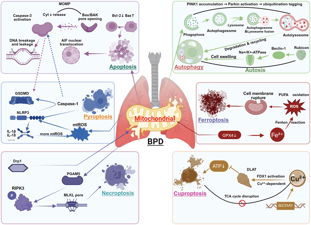 Mitochondria unequivocally stand as the central hub orchestrating disparate cell death pathways in BPD. Although not all types of cell death directly depend on mitochondria, accumulating research demonstrates the multifaceted involvement of mitochondria in cell death pathways. In addition to the cell death modalities mentioned in this review, mitochondria act as direct drivers in multiple contexts: in mitochondrial permeability transition-driven necrosis, the opening of the mitochondrial permeability transition pore leads to loss of membrane potential and energetic collapse, serving as a direct trigger for cell death (Tsujimoto et al., 2006); in extrinsic apoptosis, although initiation relies on membrane signaling via death receptors (e.g., Fas/TNF receptor 1), mitochondria participate in death signal amplification through caspase-8-mediated BH3-interacting domain death agonist cleavage, inducing MOMP (Tummers and Green, 2017); in lysosome-dependent cell death, mitochondrial functional regulation (e.g., ROS production and calcium flux) is believed to synergistically modulate lysosomal membrane permeabilization and cathepsin release (Milani et al., 2023). The intricate interplay of apoptosis, pyroptosis, necroptosis, ferroptosis, cuproptosis, and dysregulated autophagy within the mitochondrial landscape underscores its role as a unifying platform that integrates diverse death signals. As mitochondrial functions in cellular stress response, redox balance, and inflammatory signaling continue to be uncovered, their role in cell fate regulation has become increasingly prominent. This functional versatility solidifies the organelle’s position as the central regulator of cell death. Mitochondria are no longer merely “powerhouses” but indispensable “command hubs” and “executors” within the cell death network, coordinating multiple demise programs through their central positioning in metabolism, signaling, and organelle interactions.