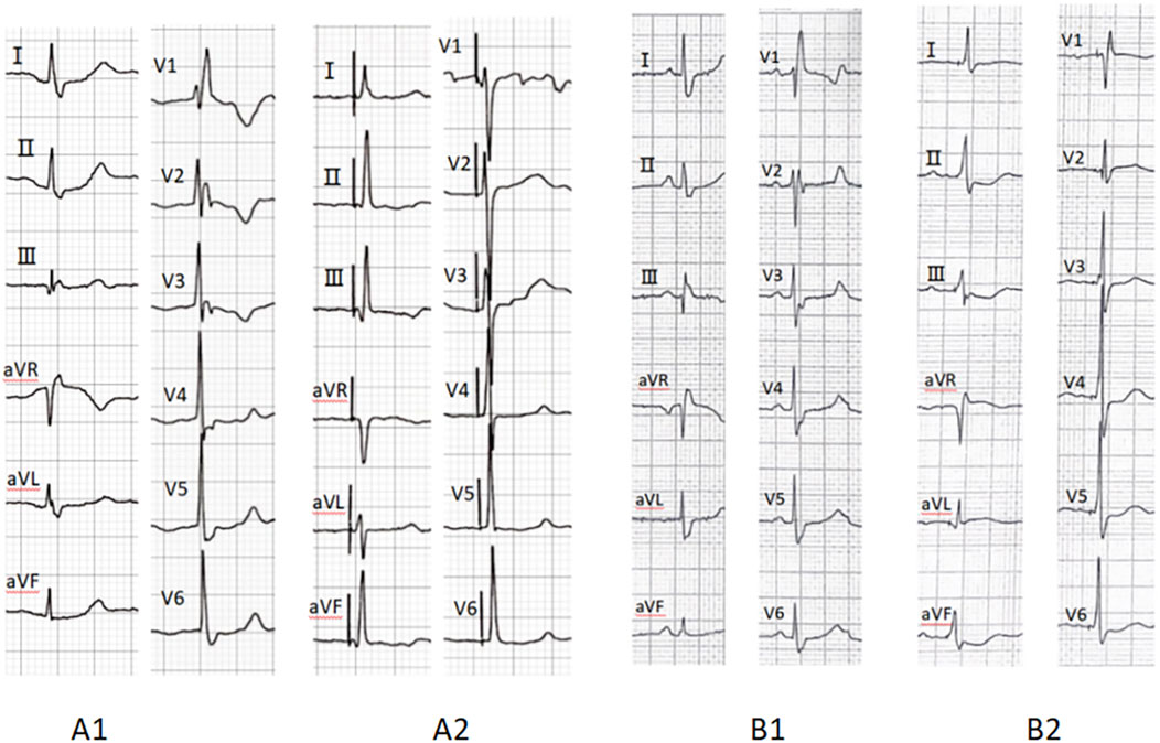 Figure 1. Preoperative ECG (A1) indicates RBBB, while A2 demonstrates complete correction of RBBB after His-bundle pacing. Preoperative ECG (B1) indicates RBBB, whereas B2 shows complete resolution of RBBB following left bundle branch pacing. RBBB, right bundle branch block; ECG, electrocardiogram.