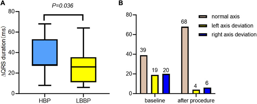 Figure 2. ECG characteristics with CSP, HBP, and LBBP in RBBB. (A) The change in the QRS duration in the HBP group was significantly shorter than that in the LBBP group. (B) The electric axis changes in CSP with RBBB patients in baseline and after procedure. ECG, electrocardiogram; CSP, conduction system pacing; HBP, His-bundle pacing; LBBP, left bundle branch pacing; RBBB, right bundle branch block.