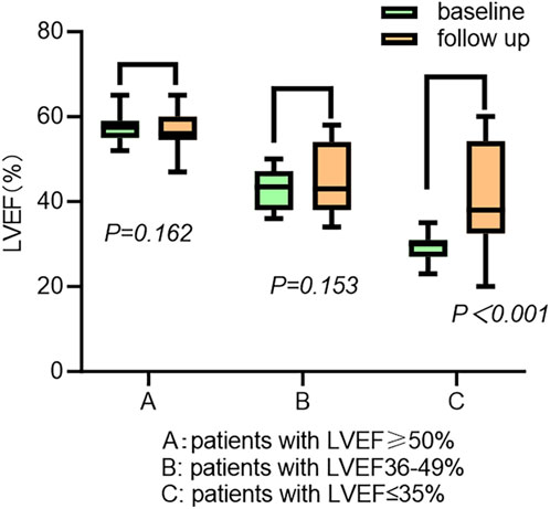 The cardiac function gradually improved during the follow-up (Table 3). The New York Heart Association (NYHA) class (2.97 ± 0.68 vs. 1.63 ± 1.08, p < 0.001), LVEF (43.79% ± 11.71% vs. 46.94% ± 10.06%, p = 0.020), and left ventricular end-diastolic diameter (LVEDD) (54.15 ± 7.67 mm vs. 52.71 ± 7.67 mm, p = 0.016) showed significant improvements following CSP. The LAD was not enlarged in the patients (44.72 ± 8.07 mm vs. 43.86 ± 8.42 mm, p = 0.114) (Table 2). The subgroup analysis outcome is presented in Table 4. LVEF improved much more significantly in patients with LVEF < 50% (36.93% ± 7.67% vs. 43.60% ± 9.96%, p < 0.001). The LAD did not show significant enlargement in any patients (43.41 ± 5.53 mm vs. 42.98 ± 6.02 mm, p = 0.537). Further subgroup analysis demonstrated that LVEF improved (30.05% ± 2.76% vs. 41.42% ± 11.61%, p < 0.001) in patients with LVEF ≤35%more than in those with LVEF 36%–49% (43.18% ± 4.69% vs. 45.59% ± 7.95%, p = 0.153) and LVEF ≥ 50% (57.52% ± 2.69% vs. 54.81% ± 4.29%, p = 0.162) (as shown in Figure 3). The LVEDD decreased in patients with LVEF ≤35% (58.52 ± 7.83 mm vs. 53.52 ± 7.39 mm, p < 0.001) but not in those with LVEF 36%–49% (43.18% ± 4.69% vs. 45.59% ± 7.95%, p = 0.153).