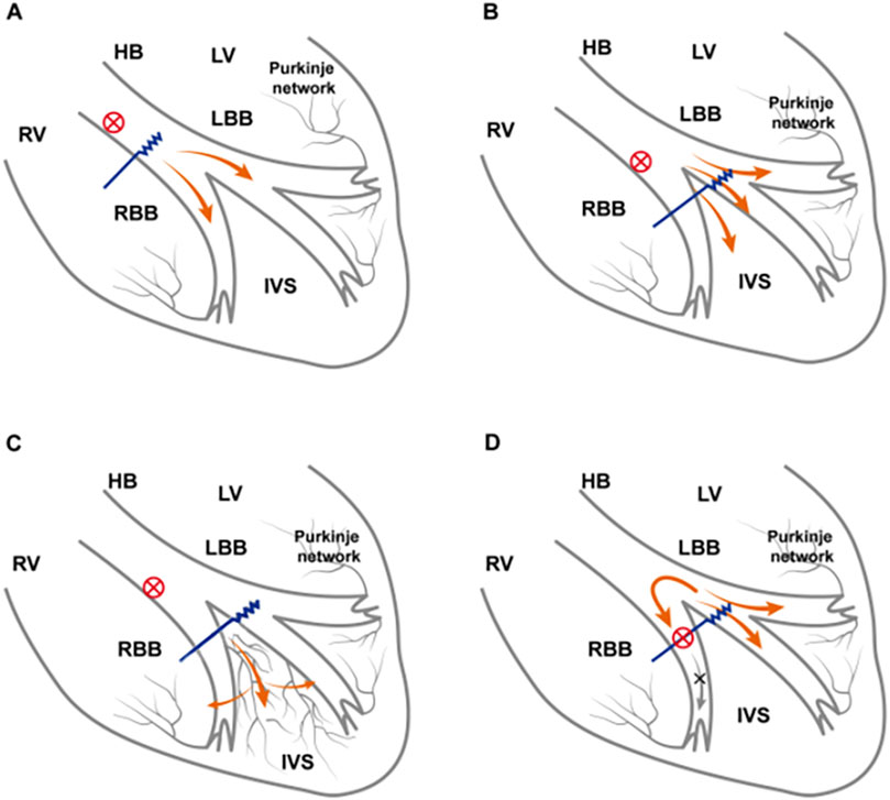 Figure 4. Electrophysiological mechanism of CSP in RBBB reverse. (A) RBBB is located within the His bundle. HBP is performed distal to the His bundle and across the lesion, correcting RBBB or relying on high-voltage pacing output to capture RBBB. (B) As the pacing output voltage increases, the left bundle branch and the local adjacent septal myocardium are captured. Greater capture of the septal myocardium partially compensates for the right ventricle excitation delay caused by RBBB and may even capture the right bundle branch beyond the conduction block, thereby correcting RBBB. (C) LBBP lead tips directly capture electrical activity of the septal Purkinje network, which forms interconnections with both left and right bundle branches, enabling rapid impulse propagation through the His–Purkinje system. (D) The block site is located at the distal right bundle branch and thus cannot be corrected by LBBP through any approach. CSP, conduction system pacing; LVEF, left ventricular ejection fraction; RBBB, right bundle branch block; HBP, His-bundle pacing; LBBP, left bundle branch pacing.