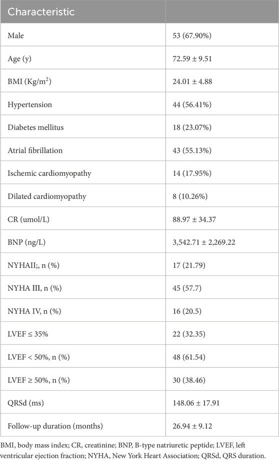 Baseline characteristics of the study population are presented in Table 1. The mean age of patients was 72.59 ± 9.51 years, with 67.90% being male. A total of 48 patients (61.54%) had LVEF< 50%, and 14 patients (17.95%) had ischemic cardiomyopathy. The baseline QRS duration was 148.06 ± 17.91 ms. Of the 88 patients, 78 (88.6%) underwent successful CSP. The average follow-up duration was 26.94 ± 9.12 months. During the follow-up period, 5 patients (6.4%) experienced all-cause mortality, and 10 patients (12.82%) were readmitted to the hospital due to heart failure.