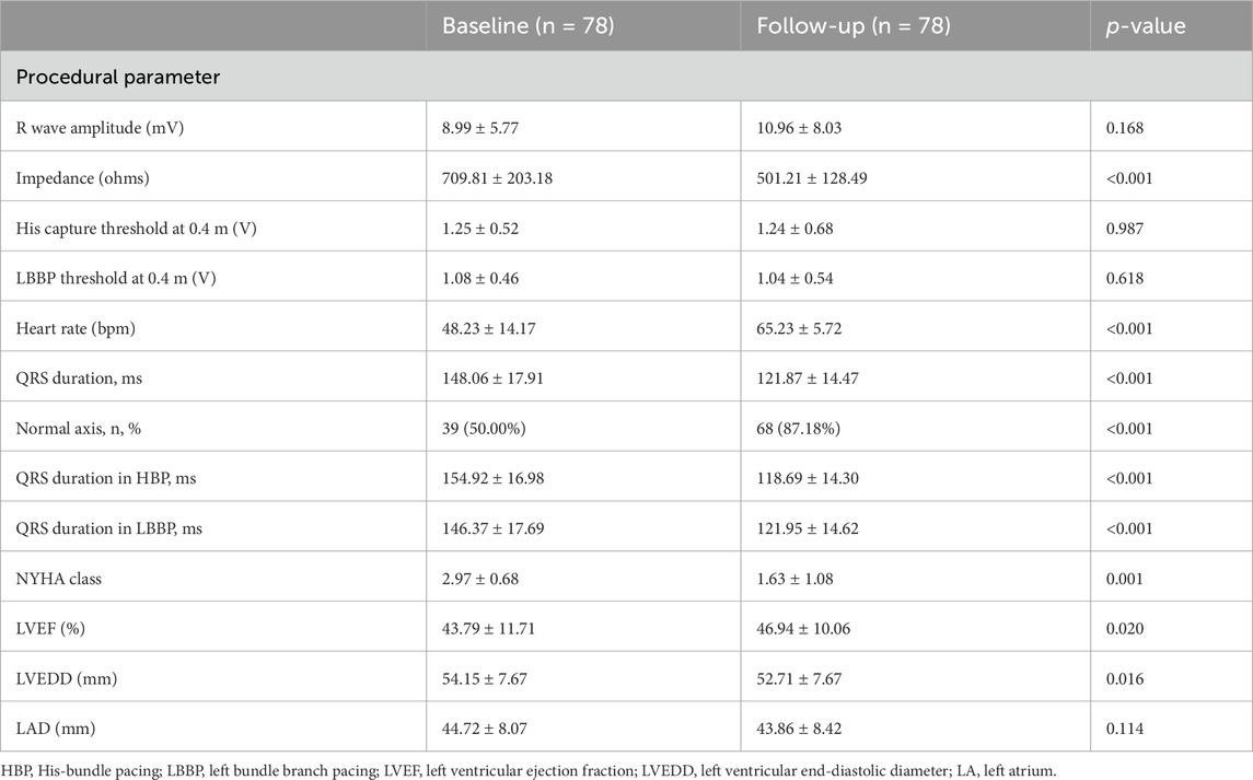 Procedural outcomes are summarized in Table 2. Among the 78 patients with CSP, 13 patients underwent His-bundle pacing, while 65 underwent LBBP. The total procedural duration averaged 78.21 ± 22.93 min. The electrocardiograms before and after CSP are shown in Figure 1. The impedance significantly decreased compared to preoperative values (709.81 ± 203.18 Ω vs. 501.21 ± 128.49 Ω, p < 0.001). The R wave amplitude remained stable after follow-up (8.99 ± 5.77 mV vs. 10.96 ± 8.03 mV, p = 0.168). The HBP (1.25 ± 0.52 V vs. 1.24 ± 0.68 V, p = 0.987) and LBBP (1.08 ± 0.46 V vs. 1.04 ± 0.54 V, p = 0.618) thresholds remained stable during follow-up, and three patients exhibited increased thresholds. The heart rate significantly increased compared to preoperative values (48.23 ± 14.17 bpm vs. 65.23 ± 5.72 bpm, p < 0.001).