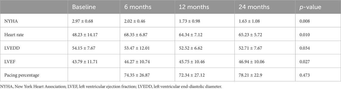 Baseline demographics and medical histories were collected at enrollment, including patient characteristics and procedure success rates. During the operation and follow-up, pacemaker parameters were recorded. Device follow-up monitored electrocardiographic parameters and lead-related complications (lead dislodgement, loss of capture, and significant increases in pacing threshold). Throughout follow-up, 12-lead electrocardiograms (ECGs), complications, and pacemaker parameters were continuously monitored. Echocardiography was scheduled at 6, 12, and 24 months after the procedure. Adverse events (thrombosis, infection, lead dislodgement, perforation, stroke, and death) were documented, with a minimum follow-up duration of 2 years.
