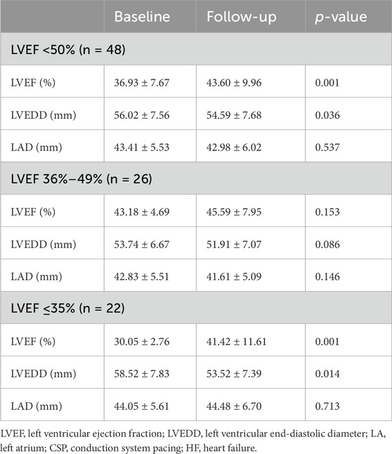 Sharma et al. (2018a) demonstrated that HBP was associated with a significant improvement in left ventricular function in patients with RBBB and reduced LVEF. Similarly, Vijayaraman et al. (2022) also found that LBBP was a feasible alternative for patients with RBBB and HF. In this present study, it was further revealed that patients with LVEF ≤35% exhibited significant LVEF improvement following CSP.