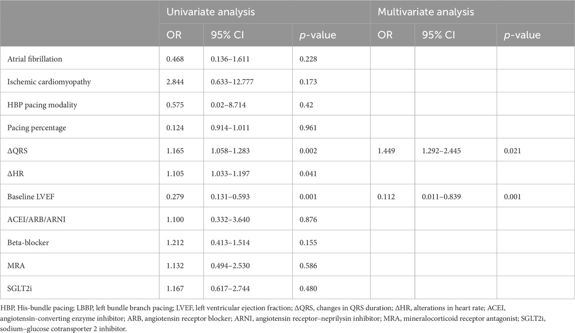 Among them, there were 48 patients with an LVEF<50%. Among these 48 patients, 27 achieved an LVEF improvement of ≥5% (27/48, 56.25%), and 17 (17/22, 77.27%) patients achieved improvement in ejection fraction among those with an LVEF ≤ 35%. The response ratio in patients with HBP and LBBP is not significantly different (62.50% vs. 55.00%, p = 0.696); however, the response ratio in patients with complete RBBB correction is higher than that in those with partial correction (70.59% vs. 45.16%, p = 0.037). Univariate and multivariate logistic regression analyses were used to identify predictors of echocardiographic response, as presented in Table 5. Our findings revealed that LVEF (OR = 0.112, 95% CI: 0.011–0.839, and p = 0.001) and ΔQRS (OR = 1.449, 95% CI: 1.292–2.445, and p = 0.021) were independent risk factors for predicting an echocardiographic response.