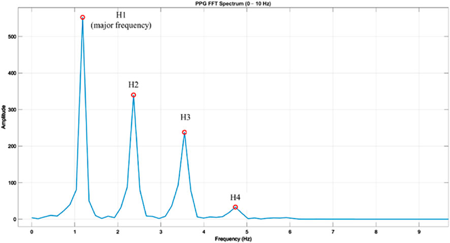 PPG FFT spectrum graph displaying from zero to ten hertz with amplitude on the y-axis and frequency on the x-axis. Peaks labeled H1 to H4 are marked in red, with H1 indicating the major frequency at around 0.8 hertz and an amplitude of over 500. Other peaks follow at approximately two, four, and five hertz with decreasing amplitudes.