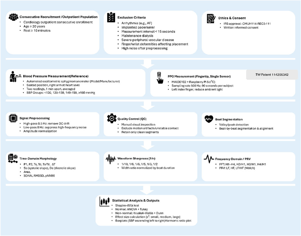 Methods: We designed a compact, noise-resistant PPG acquisition system (Taiwan Patent No. 114206342) aimed at real-world usability and recruited 590 adults from cardiology outpatient clinics. Using a validated oscillometric device, systolic blood pressure (SBP) was measured and categorized into four groups (≤120, 121–139, 140–159, ≥160 mmHg). Ninety-second fingertip PPG recordings (500 Hz) underwent careful pre-processing—filtering, normalization, and artifact rejection. We extracted 19 features covering waveform shape, sharpness, heart rate variability (HRV), and frequency-domain harmonic ratios. Group differences were assessed using ANOVA or Kruskal–Wallis tests, with post hoc analyses and effect size reporting (epsilon squared, ε2).