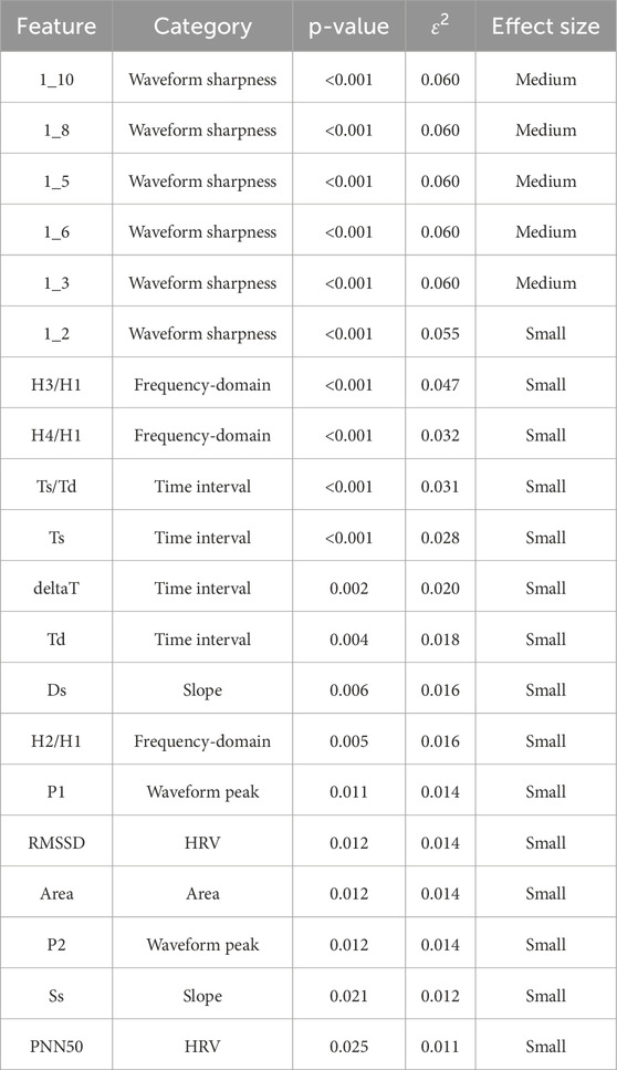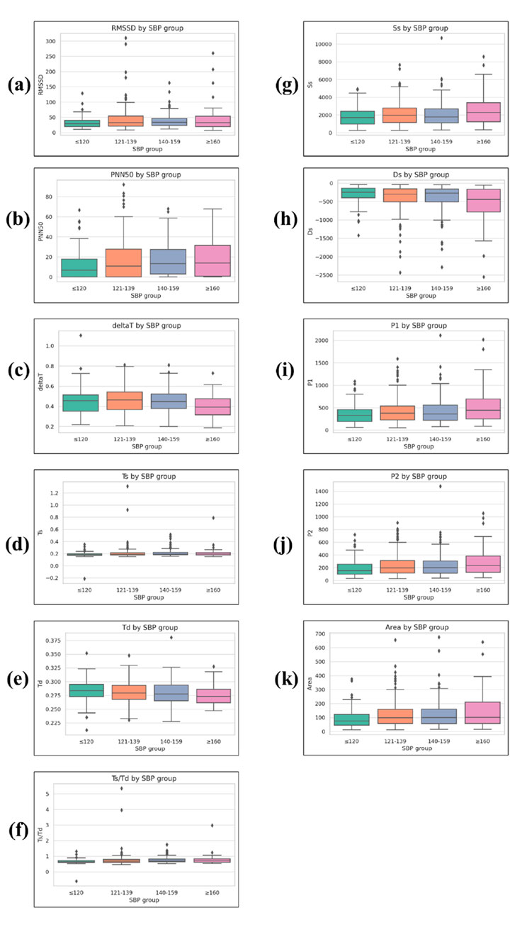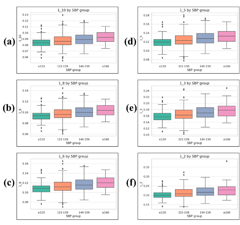 Results: Several features demonstrated strong associations with SBP levels. Waveform sharpness indices (1_10, 1_8, 1_6, 1_5, 1_3, 1_2) and harmonic ratios (H2/H1, H3/H1, H4/H1) showed a progressive decline as SBP increased—signaling a loss of higher-frequency components likely due to vascular stiffening. Time-domain features revealed that individuals with elevated SBP had prolonged systolic phases, shorter diastolic intervals, and higher Ts/Td ratios. Peak amplitudes (P1, P2), systolic and diastolic slopes, and overall waveform area also differed significantly by group. Effect sizes ranged from small to moderate, with the most pronounced changes seen in waveform sharpness.