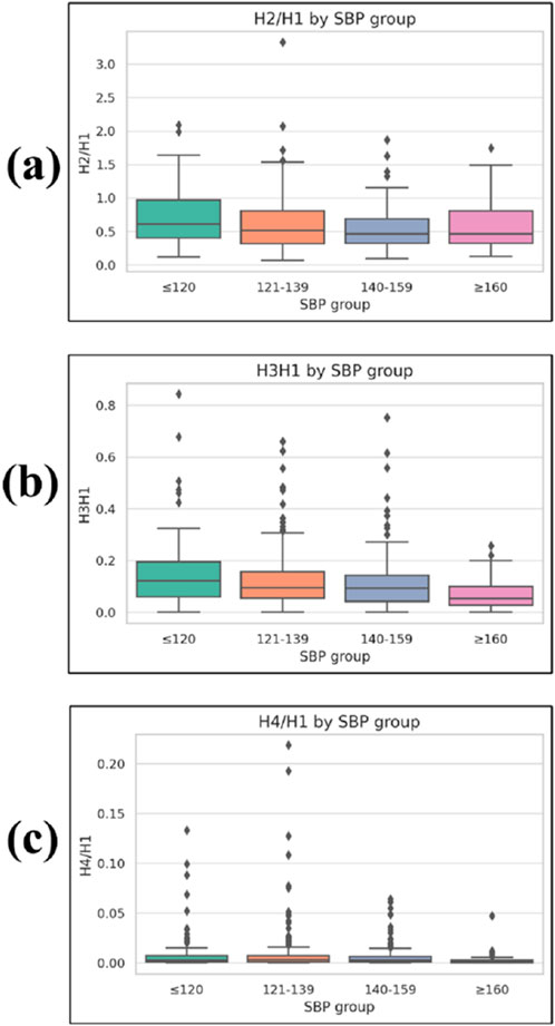 Higher-order harmonic amplitude ratios (H2/H1, H3/H1, H4/H1) decreased with increasing SBP, providing a novel spectral marker of impaired vascular compliance.