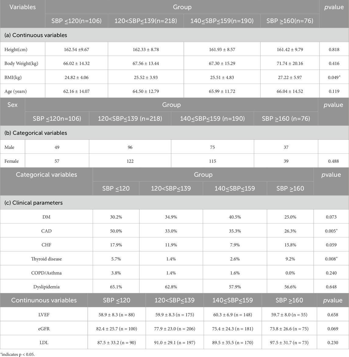For subsequent analyses, participants were categorized into four systolic blood pressure (SBP in mmHg) groups in accordance with established clinical thresholds: