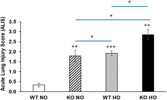 Histological analysis of hematoxylin and eosin (H&E) stained lung sections from WT and Bmi1−/− mice exposed to NO and HO was performed to determine the relevance of Bmi1 genetic deletion on lung structure. Blinded assessment of stained sections were examined by light microscopy to determine the ALIS. The lungs of WT mice exposed to 48 h of hyperoxia showed mild to moderate damage (ALIS = 1.92) including increased alveolar edema, alveolar wall thickening, and infiltration of immune cells (Table 2).