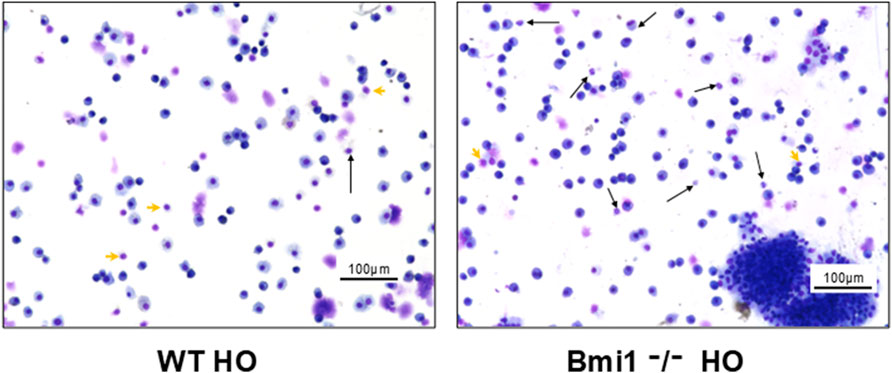 Figure 6. Analysis of Bronchoalveolar lavage fluid (BALF) from Bmi1−/− and WT mice exposed to hyperoxia. (A) WT mice, (B) Bmi1−/− mice. Representative Diff quick stained images from n = 6 mice per group. Neutrophils (black arrows) and individual lymphocytes (green arrowheads). Scale bar 100 μm.