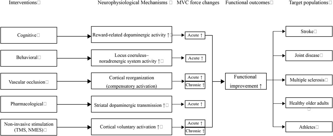 Figure 1. Conceptual flowchart illustrating how diverse interventions (cognitive, behavioral, vascular occlusion, pharmacological, and non-invasive stimulation) modulate specific neurophysiological mechanisms, leading to acute and chronic increases in maximal voluntary contraction (MVC) and subsequent functional outcomes. These adaptations benefit multiple target populations, including individuals with stroke, joint disease, multiple sclerosis, healthy older adults, and athletes. Upward arrows (↑) denote enhancement or facilitation of the respective processes.