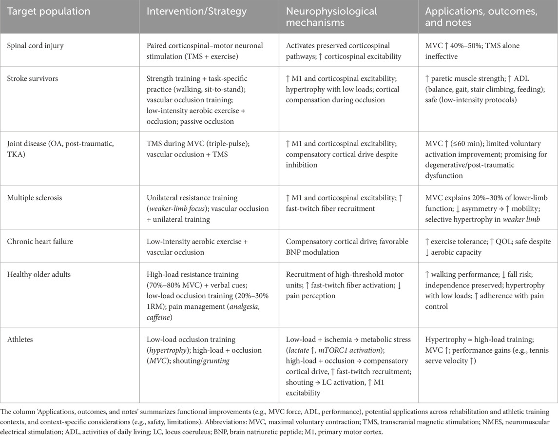 Table 1. Summary of MVC-enhancing interventions, neurophysiological mechanisms, functional outcomes, and population-specific applications.