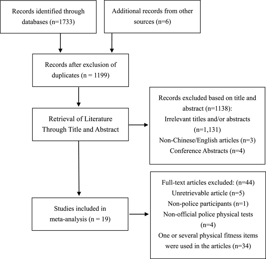 For the study to be included in the final analysis, it had to meet the following criteria: (a) the participants were police officers or probationary police officers; (b) the study focused on the development or application of officially recognized national police physical fitness tests; (c) the study was published in English or Chinese. Exclusion criteria involved: (a) police physical fitness tests not uniformly applied at the national or regional level; (b) the study only reported one or several test items of the police physical fitness tests; (c) the study was published as conference proceedings or reviews; (d) the study has unavailable full texts.