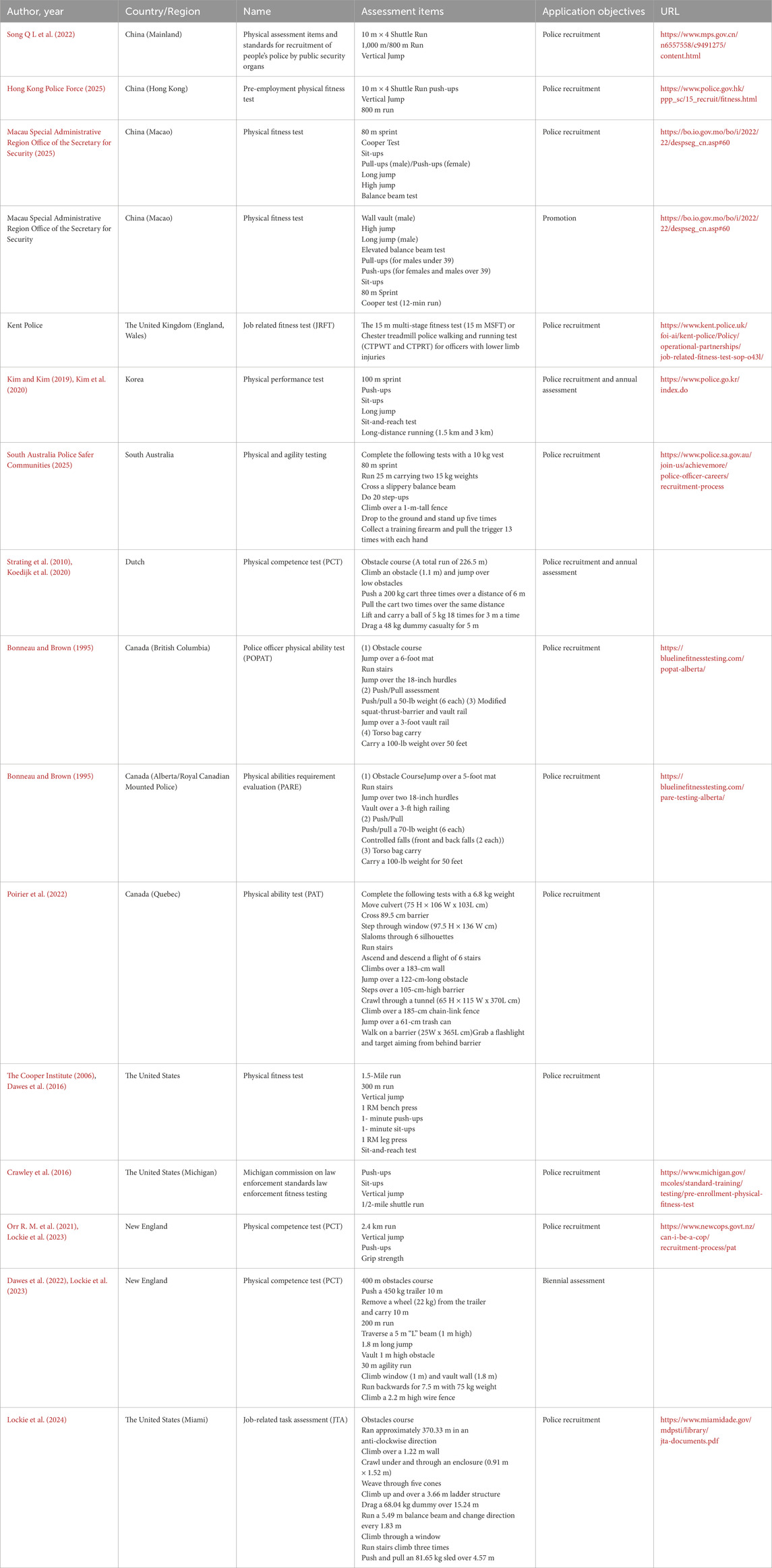 This scoping review is the first to systematically summarize standardized physical fitness test tools for police officers across nations and regions worldwide. From a global perspective, this study revealed a consensus on the importance of cardiorespiratory endurance and muscular strength and endurance in police physical fitness tests, which were consistent with previous studies (Marins et al., 2019; Massuça et al., 2022; Rasteiro et al., 2023). The reasons may be that cardiorespiratory endurance, muscular strength and endurance are not only related to the health status of police officers, but also crucial factors determining police occupational performance and injury risks (Lindsay et al., 2021). For example, foot chase and carrying to safety are closely related to the level of cardiorespiratory endurance. Muscular strength and endurance play a vital role in completing police tasks such as physical control, dragging, crossing obstacles and climbing over walls (Beck et al., 2015; Marins et al., 2019; Orr R. et al., 2021). Empirical studies also showed that police officers with high levels of cardiorespiratory endurance, muscular strength and endurance had a lower risk of injury in their occupations (Crawley et al., 2016).