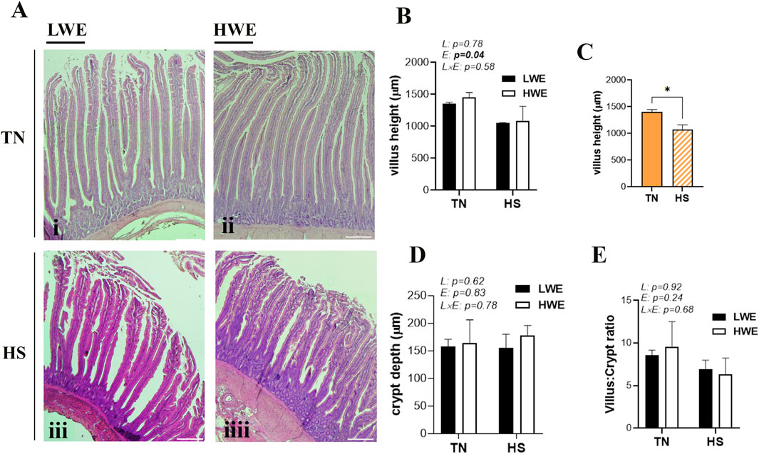 Figure 1. Duodenal histological morphology in LWE and HWE broiler chickens. (A) Representative H&E-stained sections of duodenum from LWE and HWE lines under TN and HS conditions. (B,C) Quantification of villus height (VH), (D) crypt depth (CD), and (E) the VH:CD ratio. Data are presented as the means ± SEM. Scale bar, 100 μm. * indicates a significant difference at p < 0.05. E, environment; HS, heat stress; HWE, high-water-efficient; L, line; L × E, line-by-environment interaction; LWE, low-water-efficient; TN, thermoneutral. A bold p-value indicates a significant difference.