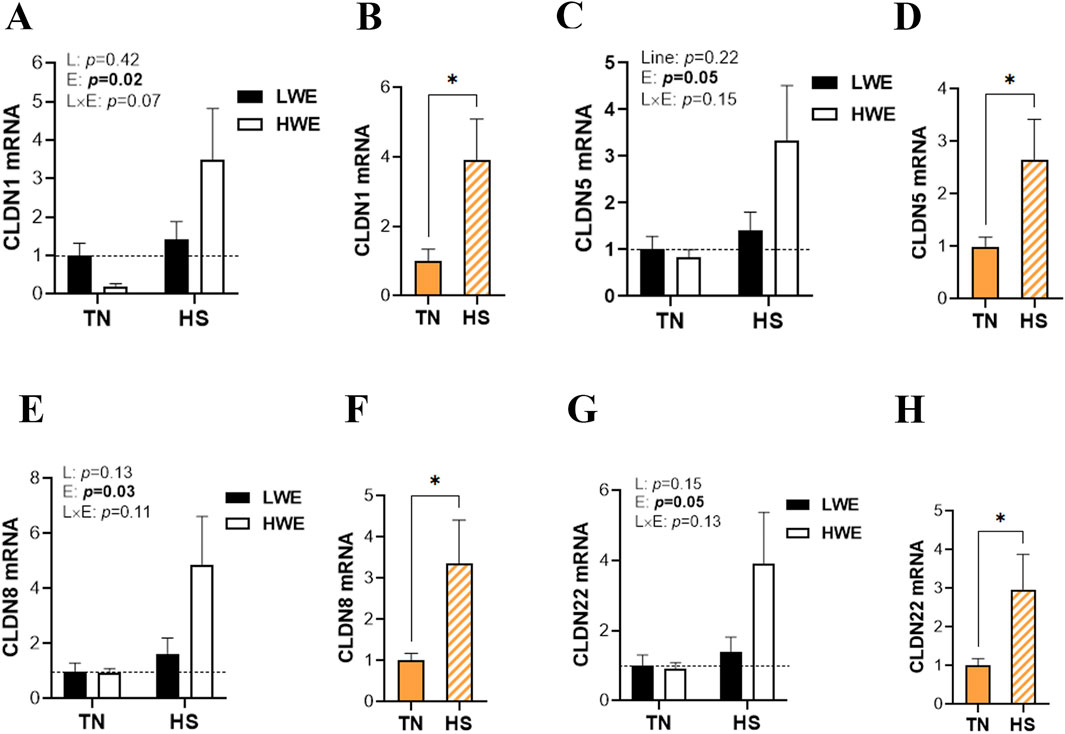 Figure 2. Effect of HS on the duodenal expression of barrier-forming claudins in HWE and LWE lines. Duodenal expressions of CLDN1 (A,B), CLDN5 (C,D), CLDN8 (E,F), and CLDN22 (G,H) were determined using qPCR and 2−ΔΔCt, with 18S rRNA as a housekeeping gene and LWE-TN or TN as a calibrator. Data are presented as the means ± SEM (n = 6/line/environmental condition). * indicates a significant difference at p < 0.05. CLDN, claudin; E, environment; HS, heat stress; HWE, high-water-efficient; L, line; L × E, line-by-environment interaction; LWE, low-water-efficient; TN, thermoneutral. A bold p-value indicates a significant difference.