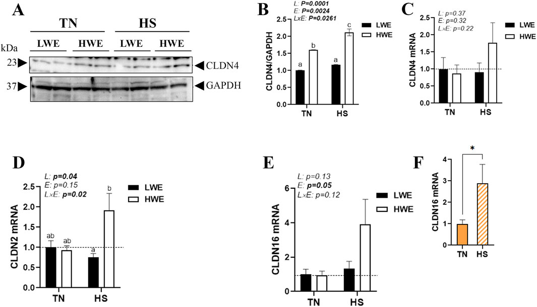 Figure 3. Effect of HS on the duodenal expression of pore-forming claudins in HWE and LWE lines. Protein levels of CLDN4 (A,B) were determined using Western blot. mRNA abundances of CLDN4 (C), CLDN2 (D), and CLDN16 (E,F) were measured using qPCR and 2−ΔΔCt, with 18S rRNA as a housekeeping gene and LWE-TN or TN as a calibrator. Data are presented as the means ± SEM (n = 6/line/environmental condition). Different superscript letters and * indicate significant differences at p < 0.05. CLDN, claudin; E, environment; HS, heat stress; HWE, high-water-efficient; L, line; L × E, line-by-environment interaction; LWE, low-water-efficient; TN, thermoneutral. A bold p-value indicates a significant difference.