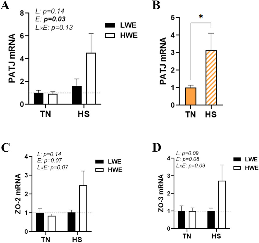 Figure 4. Effect of HS on the duodenal expression of PALS1-associated tight junction protein and zonula occludens in HWE and LWE lines. Duodenal expressions of PATJ (A,B), ZO-2 (C), and ZO-3 (D) were determined using qPCR and 2−ΔΔCt, with 18S rRNA as a housekeeping gene and LWE-TN or TN as a calibrator. Data are presented as the means ± SEM (n = 6/line/environmental condition). * indicates a significant difference at p < 0.05. E, environment; HS, heat stress; HWE, high-water-efficient; L, line; L × E, line-by-environment interaction; LWE, low-water-efficient; PATJ, PALS1-associated tight junction protein; TN, thermoneutral; ZO, zonula occludens. A bold p-value indicates a significant difference.