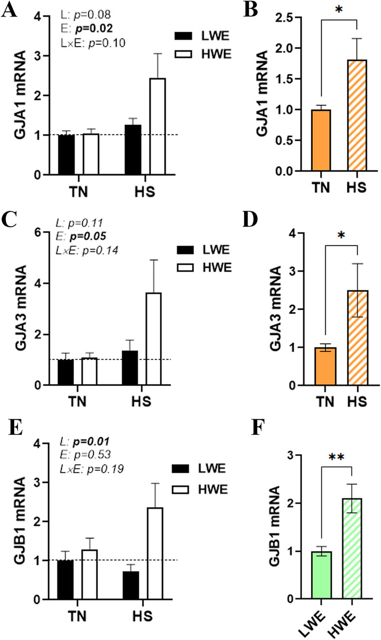 Figure 5. Effect of HS on the duodenal expression of gap junction proteins in HWE and LWE birds. Duodenal expressions of GJA1 (A,B), GJA3 (C,D), and GJB1 (E,F) were determined using qPCR and 2−ΔΔCt, with 18S rRNA as a housekeeping gene and LWE-TN, TN, or LWE as a calibrator. Data are presented as the means ± SEM (n = 6/line/environmental condition). * indicates a significant difference at p < 0.05. E, environment; GJA, gap junction protein alpha; GJB1, gap junction protein beta 1; HS, heat stress; HWE, high-water-efficient; L, line; L × E, line-by-environment interaction; LWE, low-water-efficient; TN, thermoneutral. A bold p-value indicates a significant difference.
