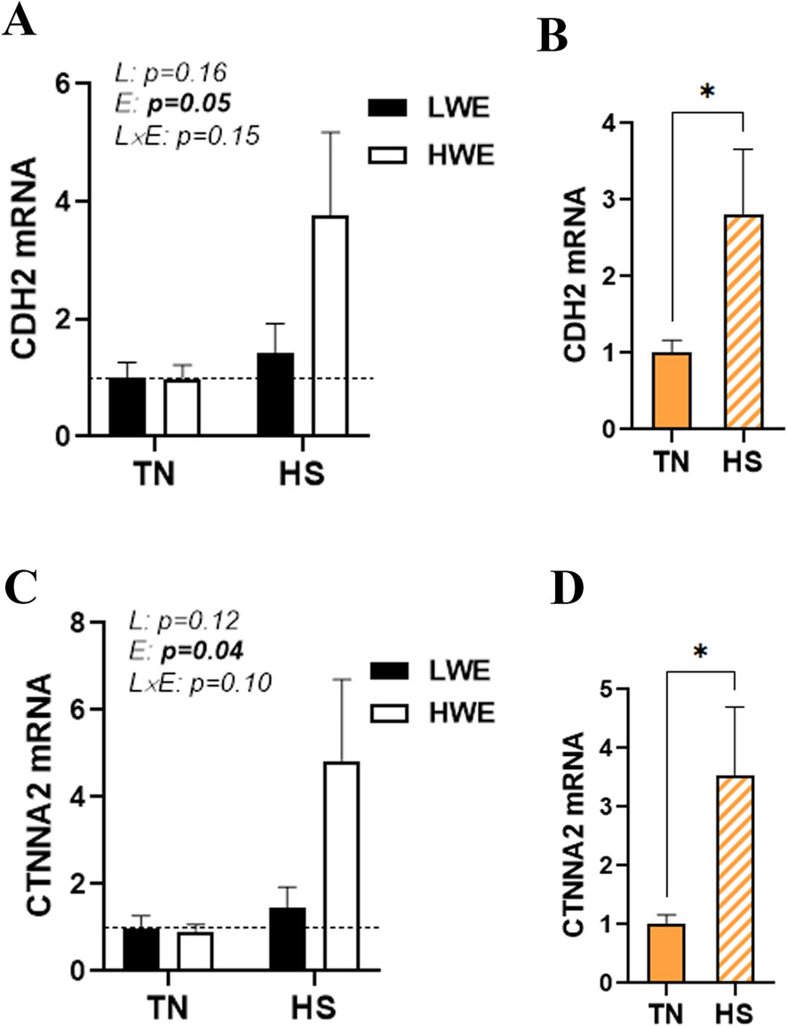 Figure 6. Effect of HS on the duodenal expression of adherens junction proteins in HWE and LWE birds. Duodenal expressions of CDH2 (A,B) and CTNNA2 (C,D) were determined using qPCR and 2−ΔΔCt, with r18S as a housekeeping gene and LWE-TN or TN as a calibrator. Data are presented as the means ± SEM (n = 6/line/environmental condition). * indicates a significant difference at p < 0.05. CDH2, cadherin; CTNNA2, catenin alpha 2; E, environment; HS, heat stress; HWE, high-water-efficient; L, line; L x E, line-by-environment interaction; LWE, low-water-efficient; TN, thermoneutral. A bold p-value indicates a significant difference.
