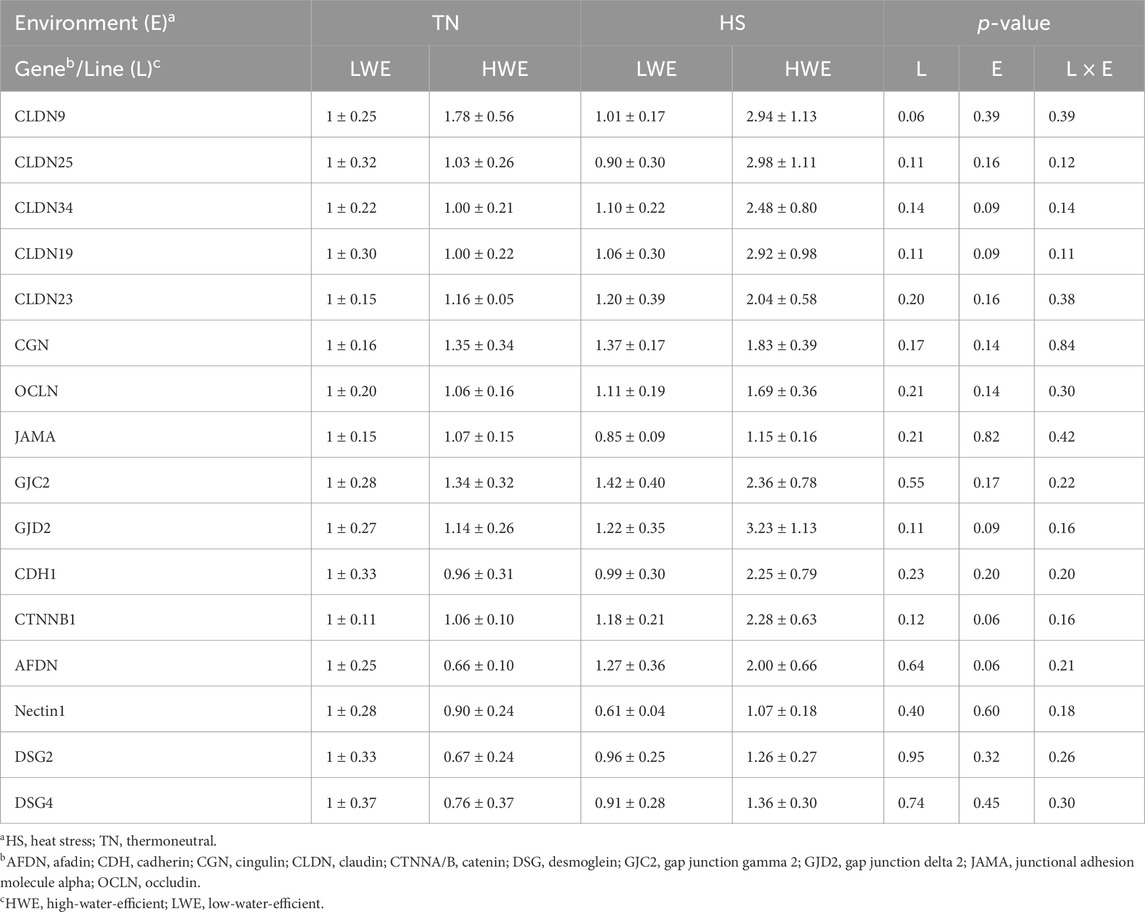 There was no significant line-by-environment interaction effect on the duodenal expression of desmoglein 2 and 4 (DSG2 and 4) (Table 1). The expressions of DSG2 and 4 remained unchanged between the HWE and LWE lines under both environmental (TN and HS) conditions (Table 1).