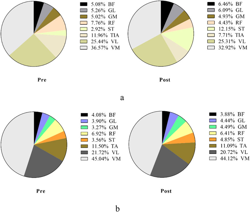 Figure 9. Overall view of MCR changes at different interventions during the pull phase at 85%–100% PPO. MCR indicates the muscle contribution ratio; RF indicates rectus femoris; VL indicates vastus lateralis; VM indicates vastus medialis; BF indicates biceps femoris, long head; ST indicates semitendinosus; GM indicates medial gastrocnemius; GL indicates lateral gastrocnemius. (a) MCR changes in the sham group. (b) MCR changes in the m-tDCS group.