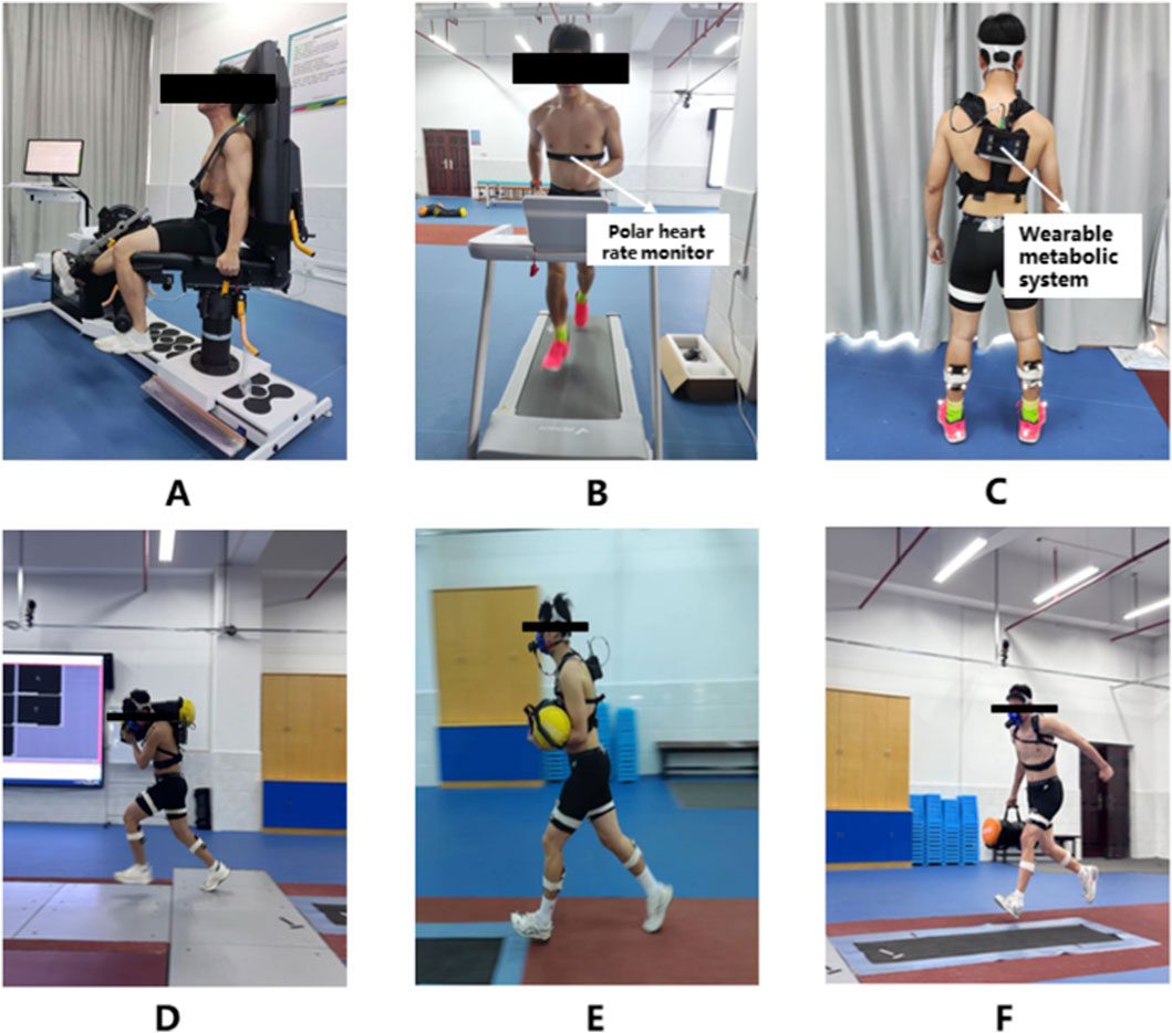 Figure 2. Experimental Process Diagram. (A) Knee fatigue induction; (B) Whole-body fatigue induction; (C) Instrument wear diagram; (D) Shoulder-carrying data collection diagram; (E) Cradle-carrying data collection diagram; (F) Hand-carrying data collection diagram.