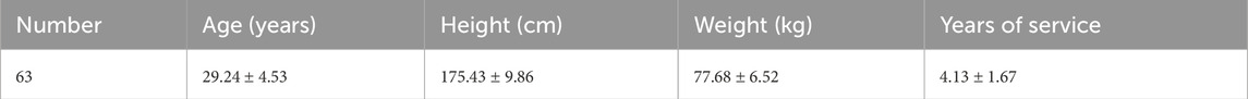 The sample size was determined a priori using G*Power software (Version 3.1). Based on a pilot study and previous related research on firefighter physiology (Tang et al., 2025), we estimated a medium-to-large effect size (f = 0.25). For a mixed-design ANOVA with within-between interaction, with an alpha level of 0.05 and a desired statistical power (1 - β) of 0.80, the analysis indicated a required total sample size of approximately 54 participants. Accordingly, this study recruited 63 professional, healthy male firefighters from the Guilin Fire and Rescue Detachment as experimental participants, with their baseline characteristics summarized in Table 2. To provide context for the physical fitness of the cohort, the mean Body Mass Index (BMI) was 25.2 ± 2.1 kg/m2. Additionally, their mean performance time for the 5 × 20-m shuttle sprint run in a non-fatigued state was 28.4 ± 2.1 s, and the mean time to exhaustion on the whole-body fatigue induction protocol was 18.5 ± 3.2 min. Descriptive statistics for task completion times and oxygen consumption values across all experimental conditions are provided in Supplementary Appendix Tables S1, S2, respectively. All participants met the following inclusion criteria: good overall physical health, standard anatomical structure and function, no history of medication use, and no injuries or illnesses within the previous 6 months. Written informed consent was obtained from each participant before testing. The study was conducted per the principles of the Declaration of Helsinki and received ethical approval from the Ethics Committee of Guangxi Normal University (Approval No. 20230419001).
