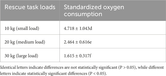Conclusion: Task load is the primary factor influencing oxygen efficiency during high-intensity shuttle sprints. Large-load tasks resulted in significantly lower standardized oxygen consumption across all fatigue states and rescue methods, indicating a “small load-low efficiency” phenomenon. Prioritizing large-load (30 kg) tasks in time-critical emergencies may improve rescue efficiency.