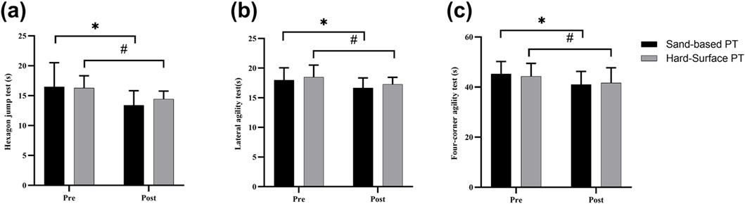 Figure 4. The effects of plyometric training on agility assessment. Values are presented as mean ± SD. (a) Hexagon jump test; (b) lateral agility test; (c) four-corner agility test. * indicates a significant difference from baseline in the Sand-based PT group; # indicates a significant difference from baseline in the Hard-surface PT group.