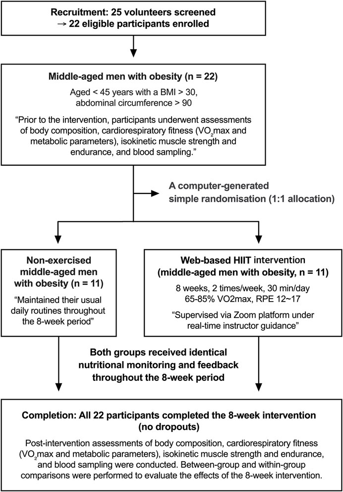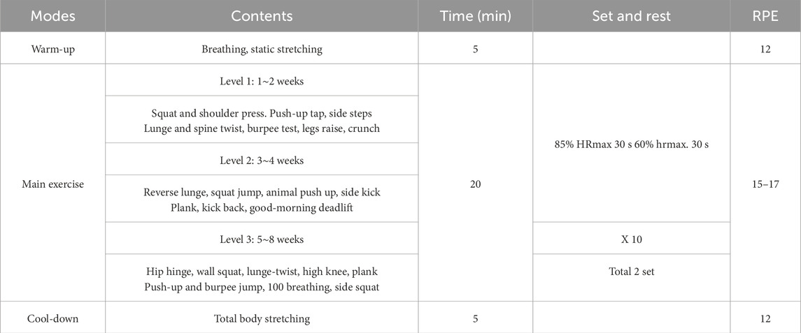The World Health Organization (WHO) and the American College of Sports Medicine (ACSM) recommend at least 150 min of moderate-intensity or 75 min of vigorous-intensity exercise per week (World Health Organization, 2020; Denay et al., 2020). However, pandemic restrictions have highlighted the value of non–face-to-face, web-based exercise programs as feasible and scalable alternatives for maintaining physical activity (de Oliveira Neto et al., 2020). Among these, bodyweight-based interval training (a form of weight-bearing exercise using one’s own body mass) has gained attention as a practical strategy for eliciting vigorous-intensity responses comparable to conventional high-intensity interval training (HIIT) modalities such as cycling or treadmill running (Li et al., 2023; Schaun et al., 2018; Bellissimo et al., 2025; Hortmann et al., 2021). Men, in particular, tend to prefer dynamic and resistance-oriented exercise modalities that engage large muscle groups and emphasize strength and power components, making bodyweight-based programs an appealing and accessible option (Chatfield et al., 2018; Oyibo and Vassileva, 2020). This type of training can be flexibly tailored through exercise selection (e.g., squats, lunges, push-ups, burpees), work-to-rest ratios, and progressive intensity adjustment, allowing individualized control over load and recovery even in home settings (Li et al., 2023). This approach involves alternating bouts of vigorous exercise and recovery, enabling substantial improvements in metabolic, cardiovascular, and muscular outcomes. Previous studies, including several meta-analyses, have consistently reported that HIIT is more effective than moderate-intensity continuous training (MICT) in reducing total and visceral fat mass, improving VO2max, and enhancing insulin sensitivity (Da Silva et al., 2020; Motiani et al., 2019; Hyun, 2021; Keating et al., 2017; Milanović et al., 2015; Jelleyman et al., 2015). A recent study reported that web-based HIIT safely improves physiological parameters and physical fitness in abdominally obese women (Hyun, 2021). However, although several web-based exercise interventions have targeted women and older adults, comparatively fewer randomized trials have focused solely on men with obesity (Dulin et al., 2023; Keshavarz et al., 2023). Accordingly, the development and validation of real-time, web-based bodyweight-interval training (BW-IT) for men with obesity are urgently required.