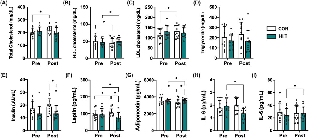 Figure 2. Effects of high-intensity interval training (HIIT) on metabolic and inflammatory markers in middle-aged men with obesity. Changes in (A) total cholesterol, (B) HDL cholesterol, (C) LDL cholesterol, (D) triglycerides, (E) insulin, (F) leptin, (G) adiponectin, (H) IL-6, and (I) IL-10 before (Pre) and after (Post) the 8-week intervention in the control (CON, white bars) and HIIT (black bars) groups. Data are presented as mean ± SD and individual data points for each participant are overlaid to visualize inter-individual variability in exercise responses. Statistical significance was determined using repeated-measures ANOVA with post hoc tests; p < 0.05 was considered statistically significant (* indicates significant difference).