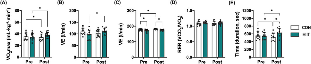 Figure 3. Effects of high-intensity interval training (HIIT) on cardiorespiratory fitness in middle-aged men with obesity. Changes in (A) maximal oxygen uptake (VO2max), (B) maximal ventilation (VE), (C) maximal heart rate (HRmax), (D) respiratory exchange ratio (RER), and (E) exercise time (duration) to exhaustion before (Pre) and after (Post) the 8-week intervention in the control (CON, white bars) and HIIT (black bars) groups. Data are expressed as mean ± SD and individual data points for each participant are overlaid to visualize inter-individual variability in exercise responses. Statistical significance was determined using repeated-measures ANOVA with post hoc tests. P < 0.05 was considered statistically significant (* indicates significant difference).