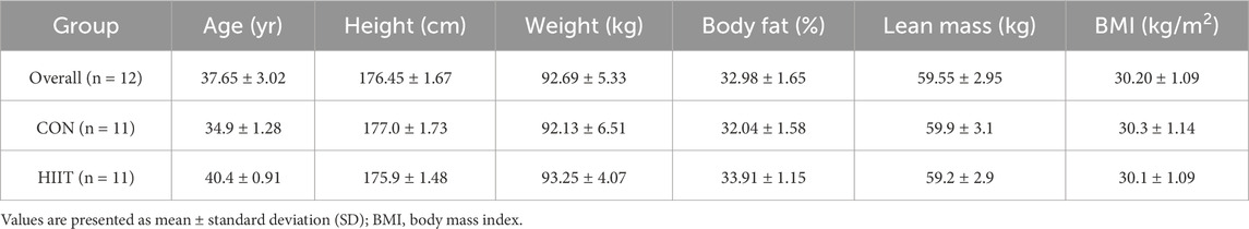 The subjects of this study were men under the age of 45 years with a body mass index (BMI) > 30 kg/m2 and an abdominal circumference >90 cm. A total of 22 men with obesity were recruited through an online community and provided written consent prior to enrollment. The consent process included information about the study purpose, procedures, potential risks, and the right to withdraw at any time (no minors were included in the study). Eligibility was confirmed through a structured telephone interview conducted by a trained researcher, during which participants were asked about their exercise habits, medical history, and medication use to verify inclusion criteria. Eligible participants were randomly allocated to either the high-intensity interval training (HIIT) group (n = 11) or the control (CON) group (n = 11) using computer-generated simple randomization (1:1 allocation), as illustrated in Figure 1. The randomization sequence was created using a pseudo-random number generator by an independent researcher not involved in data collection or analysis. Allocation concealment was maintained until completion of baseline testing. No stratification or blocking was applied because of the small sample size, and while participants and exercise supervisors were aware of group assignments, outcome assessors and the statistician were blinded to allocation to minimize bias. This study was approved by the Institutional Ethics Committee of Korea National Sport University (KNSU) (KNSU-20210916-141) and conducted in accordance with the Declaration of Helsinki. The physical characteristics of subjects are summarized in Table 1.