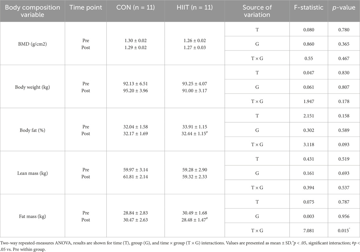 Statistical analyses were performed using IBM SPSS Statistics, version 24.0 (IBM Corp., Armonk, NY, United States). Descriptive statistics are presented as means and standard deviations (SD). To evaluate the effects of the intervention, a two-way repeated-measures analysis of variance (ANOVA) with a 2 (group: HIIT vs. CON) × 2 (time: pre vs. post) design was conducted for each variable. When significant interactions were observed, simple-effects analyses were performed using paired t-tests to assess within-group changes over time and independent samples t-tests to compare between-group differences at each time point. Although the mean age differed slightly between groups (34.9 vs. 40.4 years), baseline comparisons confirmed that this difference was not statistically significant (p > 0.05). Random allocation and the within-subject nature of the repeated-measures design further minimized the potential influence of age-related confounding. Given the limited sample size and exploratory aim of this pilot trial, age was not included as a covariate to avoid model overfitting and unnecessary reduction of statistical power. Regarding multiplicity, no formal across-outcome correction for multiple comparisons (e.g., Bonferroni, Holm) was applied because tests targeted conceptually distinct physiological domains in this exploratory study; we therefore emphasize effect sizes and interpret p-values cautiously. Effect sizes were calculated and reported as partial eta squared (ηp2) for ANOVA and Cohen’s d (d) for within-group paired t-tests. According to established conventions, ηp2 values of 0.01, 0.06, and 0.14 were interpreted as small, medium, and large effects, respectively, while Cohen’s d values of 0.2, 0.5, and 0.80 were considered small, medium, and large. Statistical significance was set at p < 0.05.
