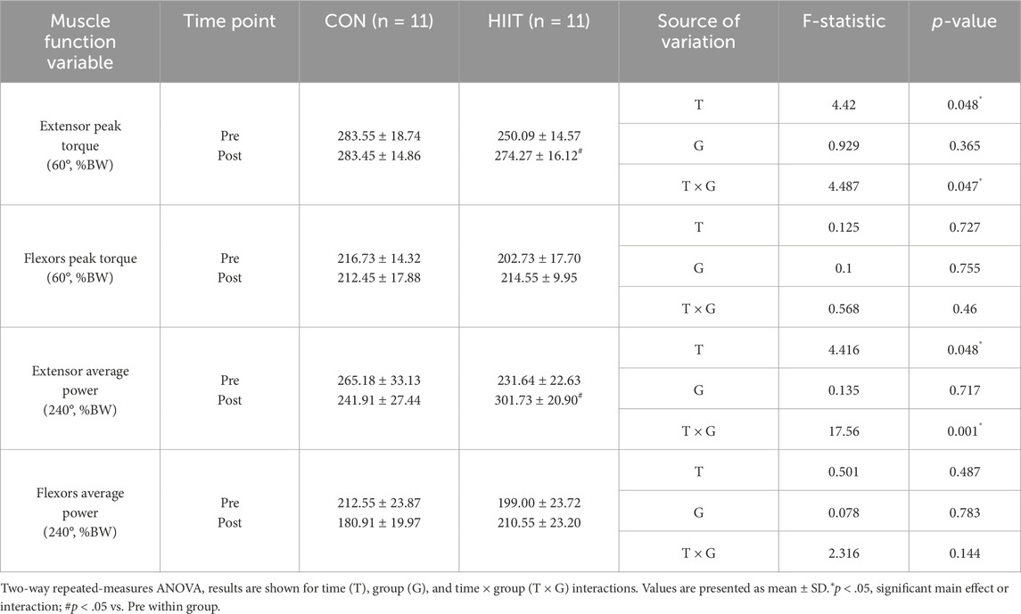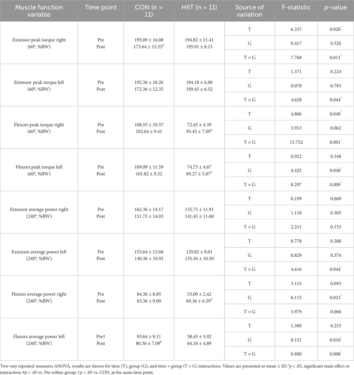 For muscular endurance (average power at 240°·s-1), right-leg extension (EAPR: F (1, 20) = 2.211, p = 0.153) and right-leg flexion (FAPR: F (1, 20) = 3.979, p = 0.060) showed no significant interactions, whereas left-leg endurance exhibited significant interactions for extension (EAPL: F (1, 20) = 4.616, p = 0.044, ηp2 = 0.188) and flexion (FAPL: F (1, 20) = 8.800, p = 0.008, ηp2 = 0.306). Simple-effects tests showed a time-related increase in right-leg flexion power within the HIIT group (t (10) = −2.695, p = 0.022, d = 0.81) and a decrease in left-leg flexion power within the CON group (t (10) = −2.381, p = 0.039, d = 0.72). Baseline between-group differences were also present for FAPR (pre: t (20) = 3.419, p = 0.003) and FAPL (pre: t (20) = 3.383, p = 0.003). Taken together, lower-extremity outcomes displayed domain-specific, group-dependent trajectories. Peak torque changes differed between groups (notably larger interaction effects for flexion torque; ηp2 = 0.29–0.41), and endurance outcomes showed side-specific interactions (left > right; ηp2 = 0.19–0.31). These patterns indicate differential adaptations of knee musculature across groups over the 8-week period, rather than uniform improvement in all indices.