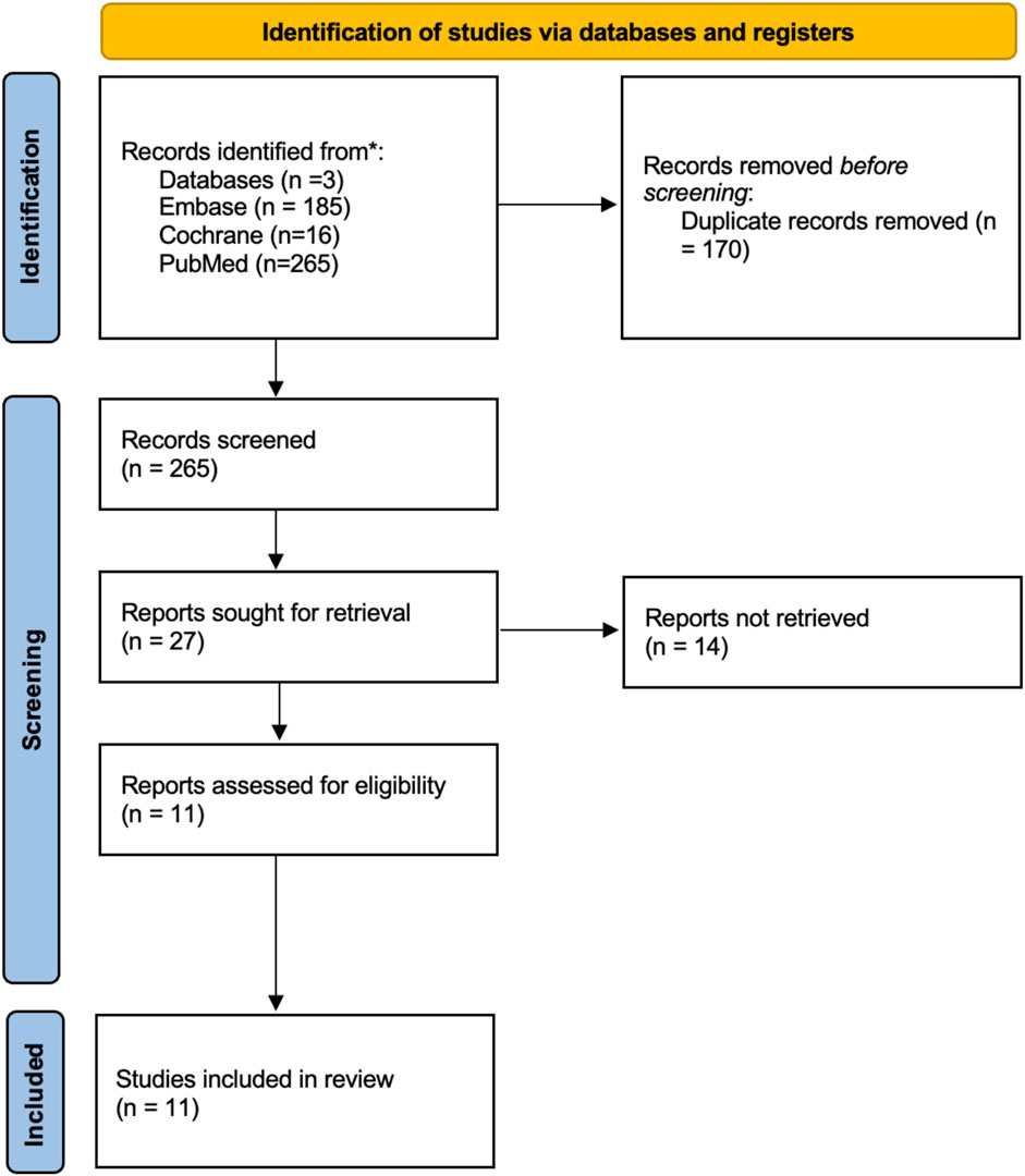 Flowchart of study selection process through databases and registers. Identification phase shows records from databases: Embase (n=185), Cochrane (n=16), and PubMed (n=265). After removing 170 duplicates, 265 records were screened. In the screening phase, 27 reports needed retrieval; 14 were not retrieved. Eleven reports assessed for eligibility. Eleven studies included in the review.