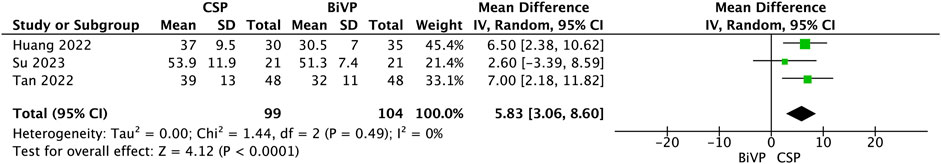 Forest plot comparing CSP and BiVP studies by Huang 2022, Su 2023, and Tan 2022. It shows mean differences with confidence intervals. Heterogeneity is low with I² = 0% and a significant overall effect with a Z score of 4.12 (p < 0.0001). Total mean difference is 5.83 [3.06, 8.60].