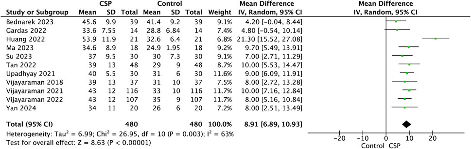 Forest plot showing mean differences between CSP and control groups across various studies. The plot includes studies from 2018 to 2024 with mean differences and confidence intervals. The overall effect size is 8.91 with a 95% confidence interval of 6.89 to 10.93. Heterogeneity is indicated with Tau squared 6.99, Chi-squared 26.95, degrees of freedom 10, and I squared 63%, with a significant P-value less than 0.0001.