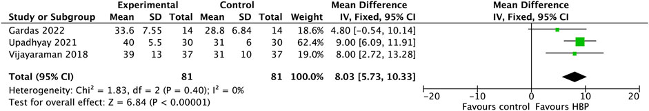 Forest plot showing mean differences from three studies: Gardas 2022, Upadhyay 2021, and Vijayaraman 2018. The overall effect size is 8.03 with a 95% confidence interval of 5.73 to 10.33, favoring HBP. Heterogeneity is low with Chi-squared equals 1.83, degrees of freedom equals 2, and I-squared equals 0%. The test for overall effect shows Z equals 6.84, P less than 0.00001.