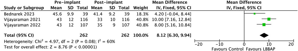 Forest plot showing mean differences of three studies comparing pre- and post-implant values. The studies are Bednarek 2023, Vijayaraman 2021, and Vijayaraman 2022. Mean differences are 4.20, 10.00, and 8.00, respectively. The overall mean difference is 8.12, favoring the LBBAP side, with a 95% confidence interval of 6.30 to 9.94. Heterogeneity is moderate with an I-squared value of 60%. The plot includes confidence intervals and weights.